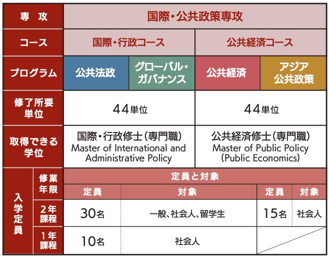 法学研究科の教員が担当する国際・行政コースには、「公共法政プログラム」と「グローバル・ガバナンス・プログラム」、経済学研究科の教員が担当する公共経済コースには、「公共経済プログラム」と「アジア公共政策プログラム」があります。